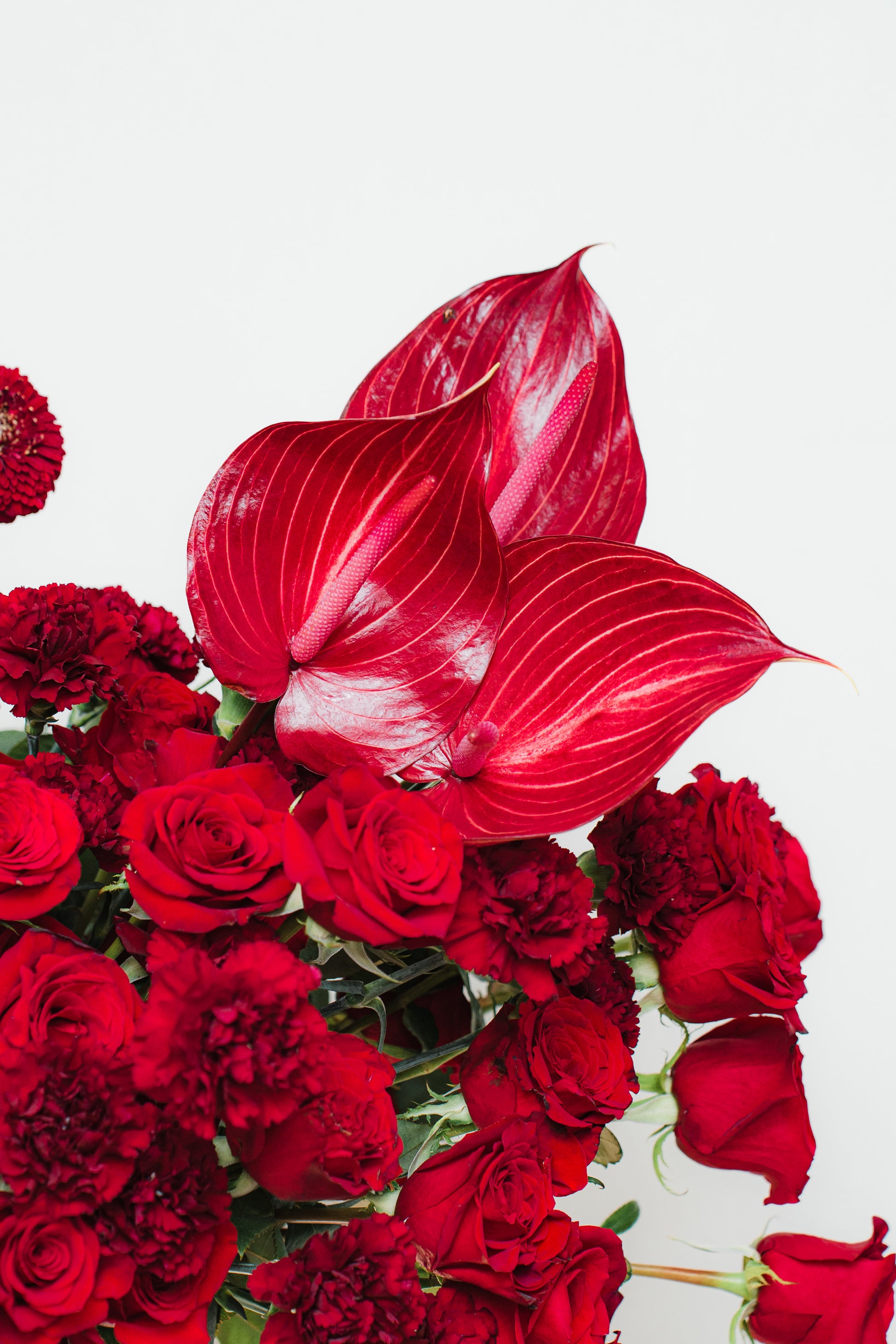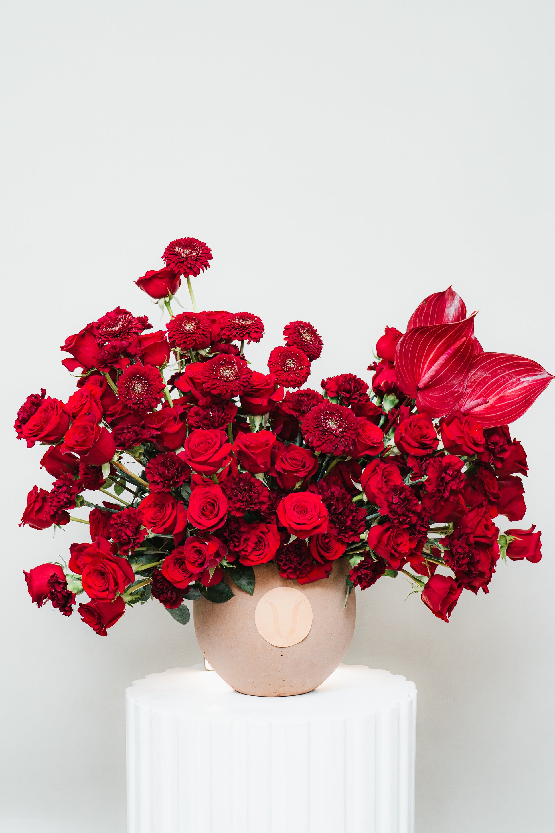 A lush, dense monochromatic arrangement of premium red roses and vibrant anthuriums for Valentine's Day, presented in a rounded terracotta-style ceramic vase