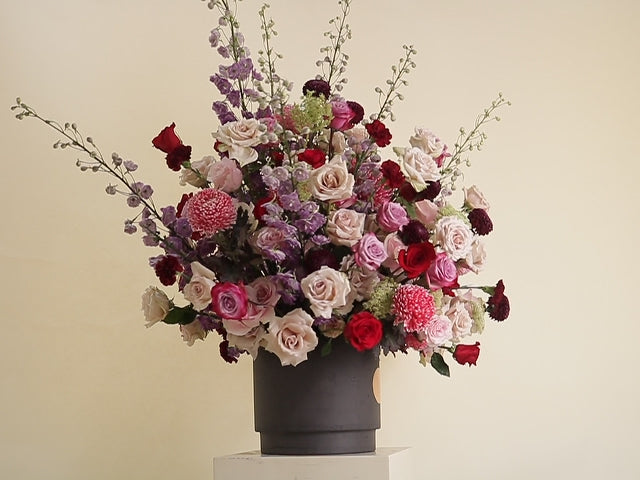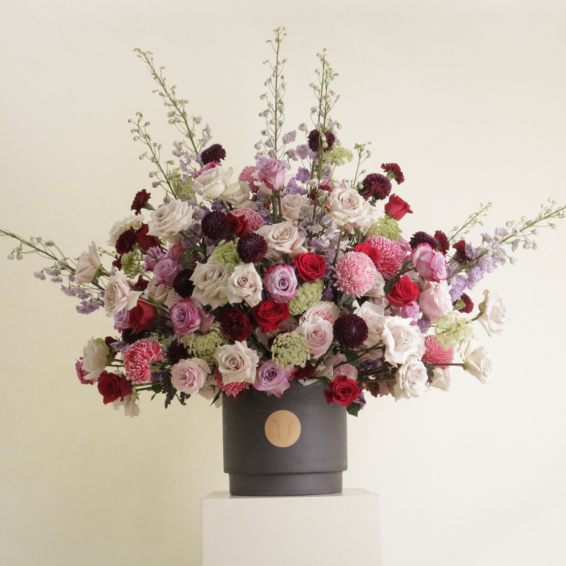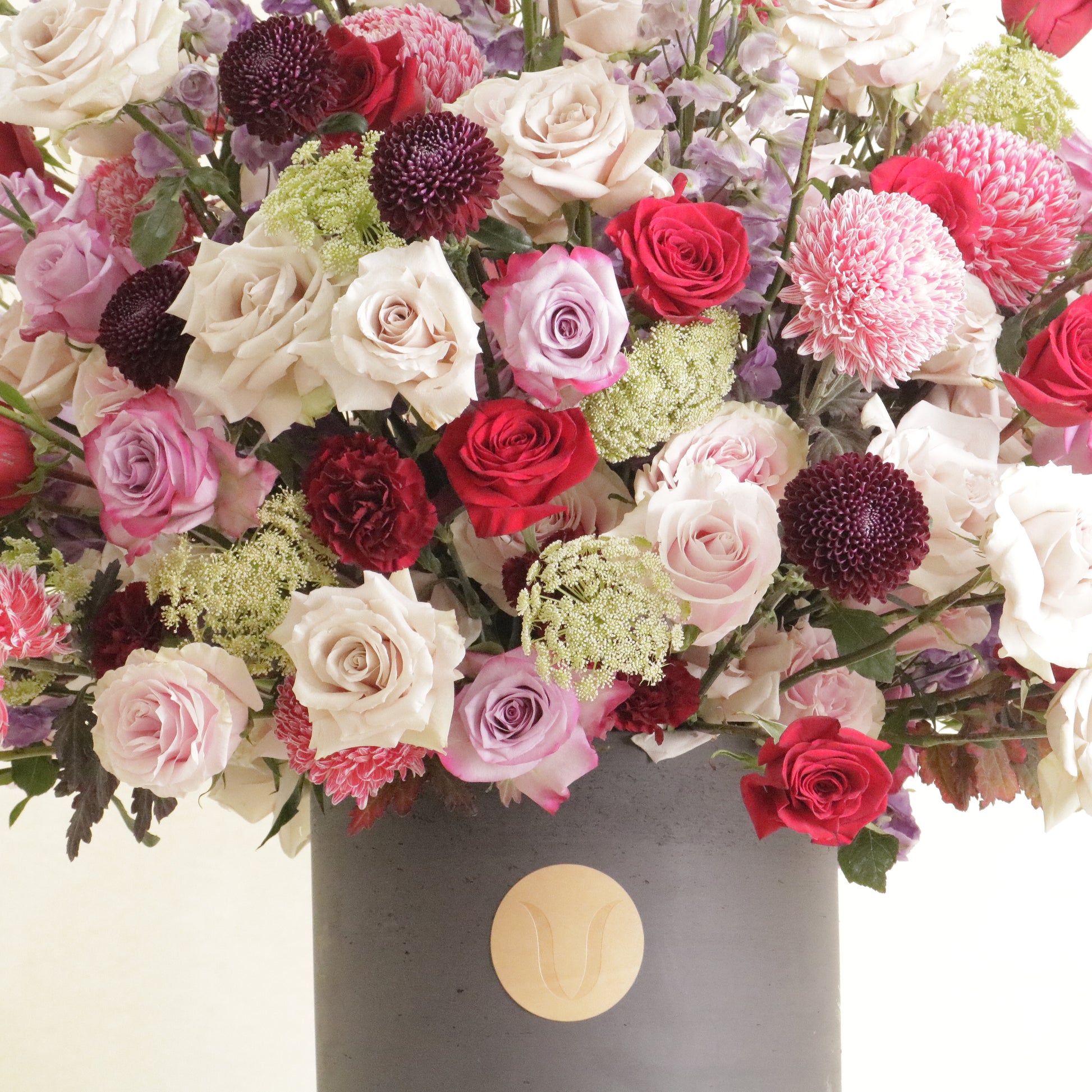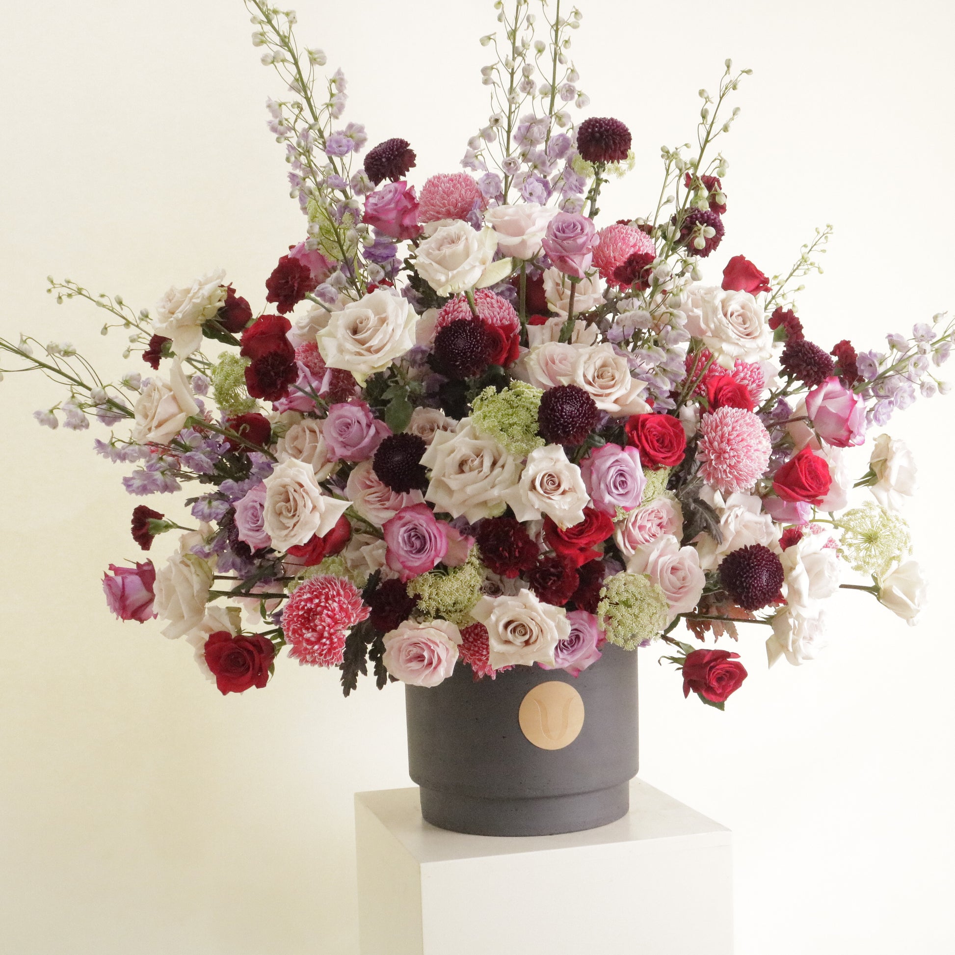 A luxurious floral arrangement featuring a harmonious blend of premium roses in soft blush, ivory, and deep red tones, complemented by seasonal blooms and delicate filler flowers. Expertly designed in a modern signature vase, this statement piece radiates elegance, romance, and refined artistry, perfect for Valentine’s Day, anniversaries, luxury gifting, and sophisticated interior décor