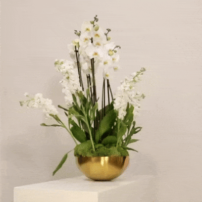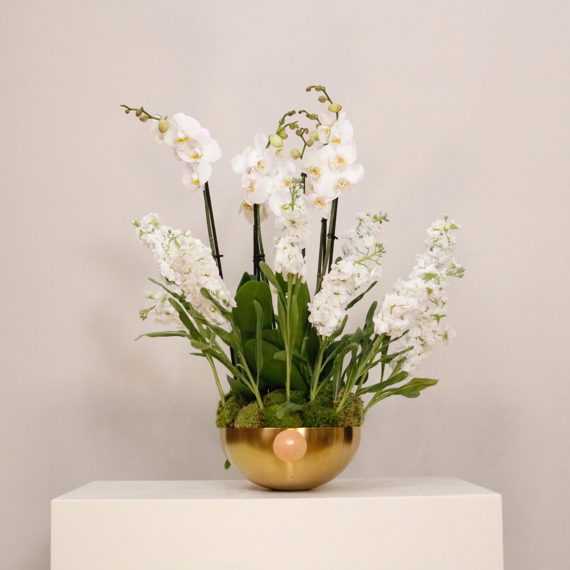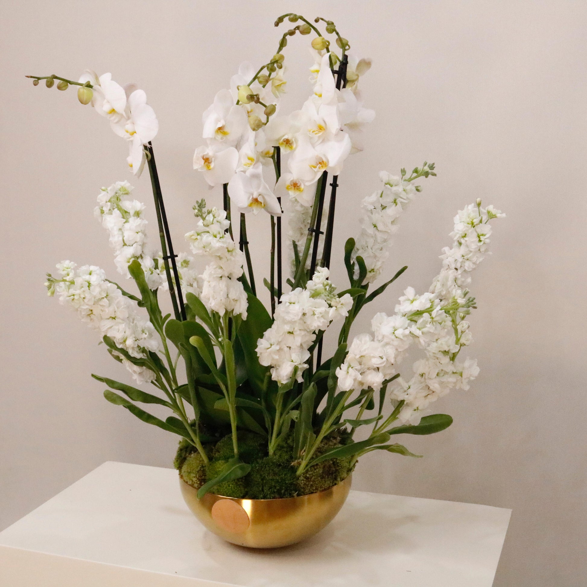 Orchid plants in a classic arrangement with delicate white Mathiola flowers will add a celebration to your moments